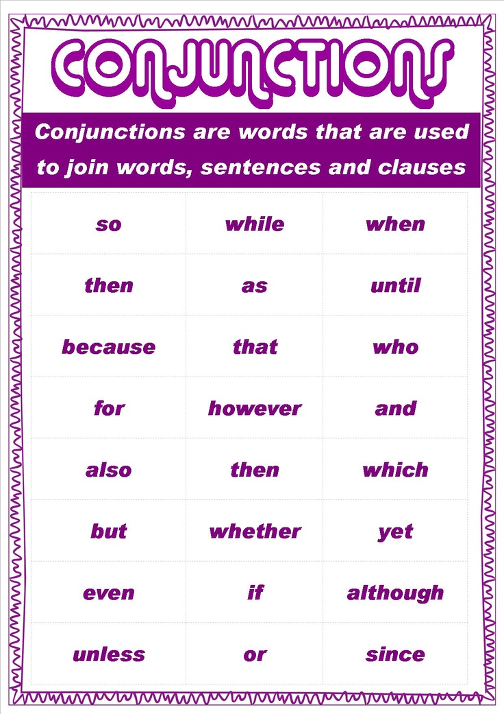 Conjunctions- A conjunction is a word used to connect words, phrases, or clauses.