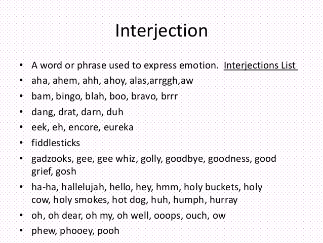 Interjections- Interjections are words used to express strong feeling or sudden emotion.