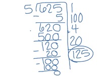 Ways to divide- One way to divide is to use the Big 7. When you use the Big 7, you put the number you are multiplying the divisor by alongside the longest part of the 7 and once you’ve divided the number down all the way, you add all of the numbers up to get your answer. The problem 625 divided by 5 is shown below.