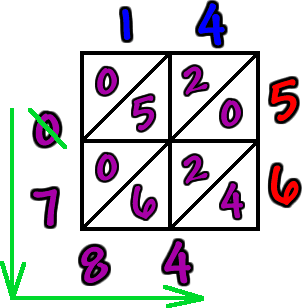 The other way is to use the lattuce. The lattuce is a little bit more tricky, and might need a little bit more practice to master. When you multiply with the lattuce, you add the numbers in each diagonal column up to get a product. The problem 14 x 56 is solved below using the lattuce.