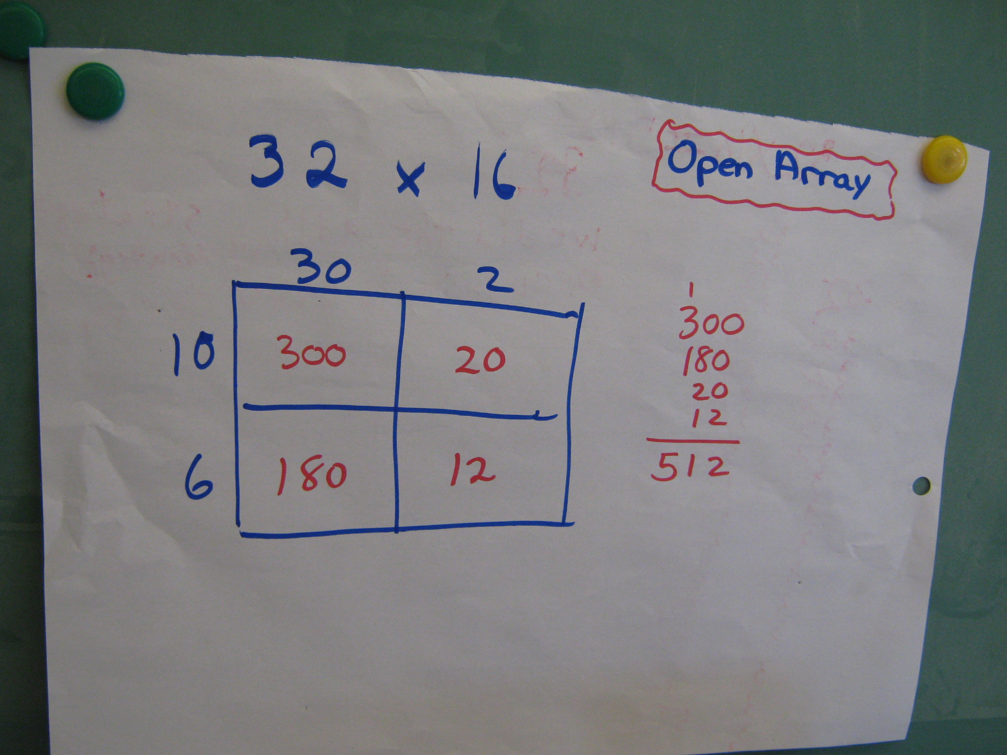 Ways to multiply- There are two simple ways to multiply. The first way is to use the open array. When you use the open array, you split the digits apart from each other and multiply separately. When you have all of the separate products, add your products all up to get your answer. In the problem 32 x 16, you make 32 into 30 and 2 and you make 16 into 10 and 6 then you multiply separately. 30 x 10=300, 2 x 10=20, 30 x 6=180, and 2 x 6=12. Then add 300+20+180+12 to get 512 as your total. A picture of this problem is shown below.
